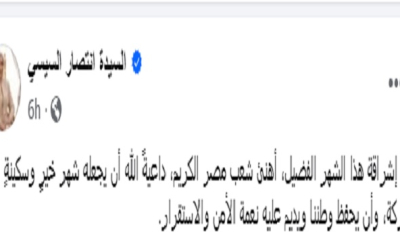 السيدة انتصار السيسى تهنئ الشعب المصرى بحلول شهر رمضان المبارك