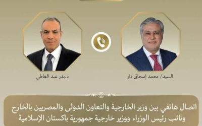 تلقى الدكتور بدر عبد العاطى وزير الخارجية والتعاون الدولى والمصريين بالخارج اتصالاً هاتفياً اليوم من السيد محمد إسحاق دار نائب رئيس الوزراء وزير خارجية جمهورية باكستان الإسلامية وذلك فى...