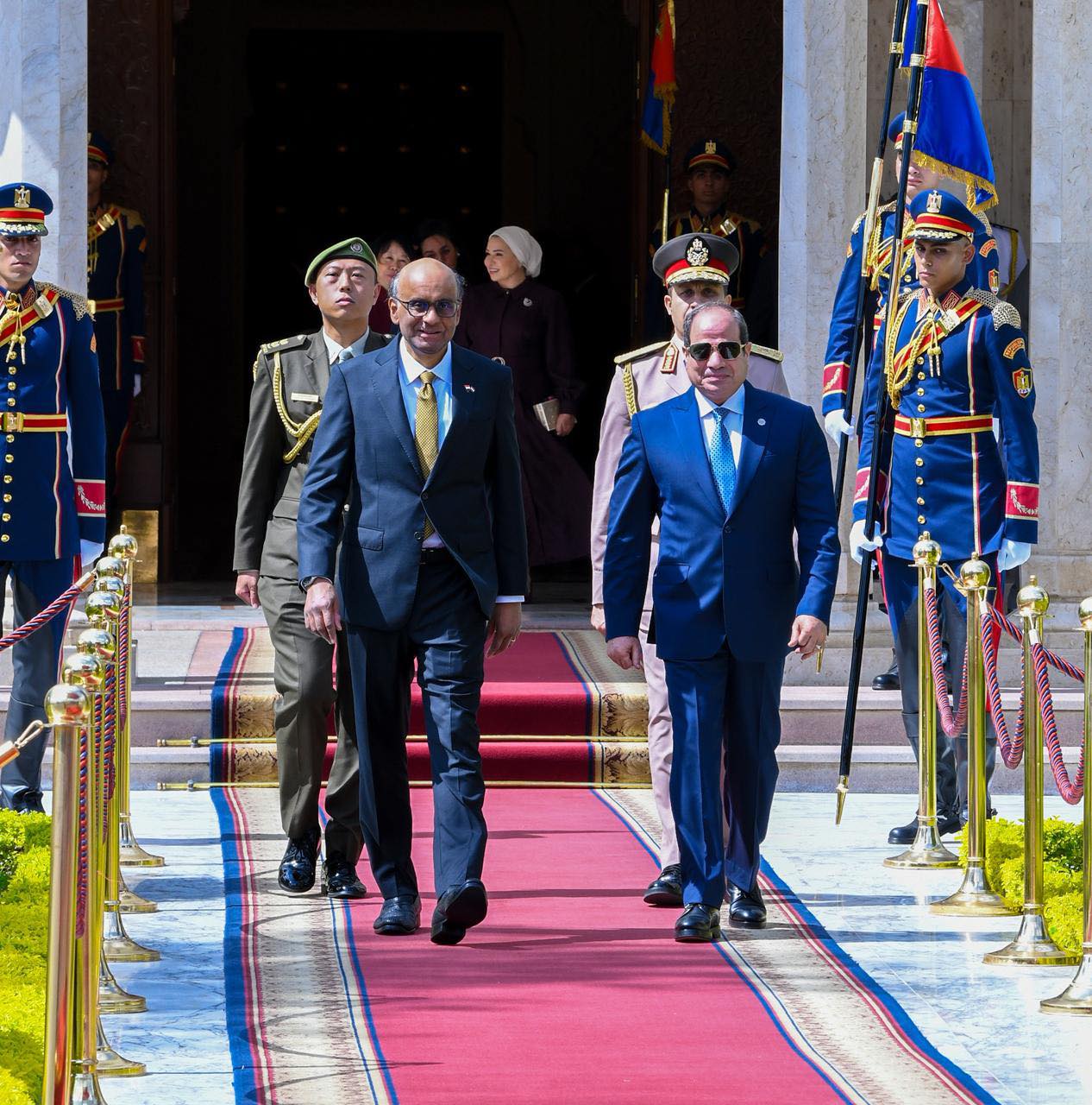 استقبل السيد الرئيس عبد الفتاح السيسي، والسيدة انتصار السيسي، قرينة السيد رئيس الجمهورية، اليوم بقصر الاتحادية، السيد/ ثارمان شانموجار أتنام رئيس جمهورية سنغافورة والسيدة جين يوميكو إتوجي قرينة سيادته، وذلك في إطار الزيارة الرسمية التي يقوم بها السيد الرئيس السنغافوري إلى جمهورية مصر العربية.