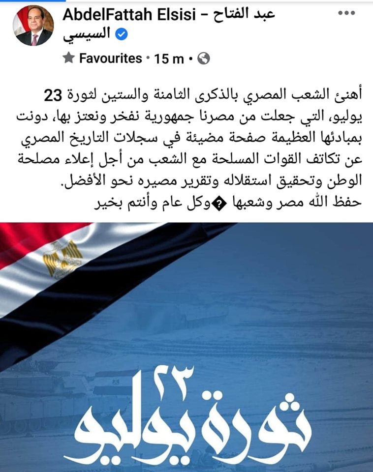 وقال الرئيس السيسي، فى تدوينة على صفحته الرسمية بمواقع التواصل الاجتماعي اليوم الخميس، “أهنئ الشعب المصري بالذكرى الثامنة والستين لثورة 23 يوليو، التي جعلت من مصرنا جمهورية نفخر ونعتز بها، دونت بمبادئها العظيمة صفحة مضيئة في سجلات التاريخ المصري عن تكاتف القوات المسلحة مع الشعب من أجل إعلاء مصلحة الوطن وتحقيق استقلاله وتقرير مصيره نحو الأفضل. حفظ الله مصر وشعبها، وكل عام وأنتم بخير”.