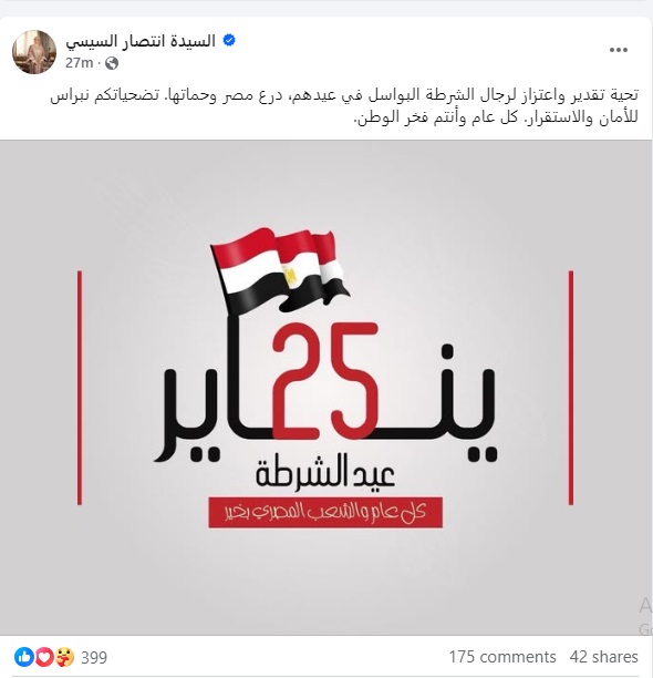 وكتبت قرينة الرئيس، على صفحتها بموقع «فيسبوك»: تحية تقدير واعتزاز لرجال الشرطة البواسل في عيدهم، درع مصر وحماتها.