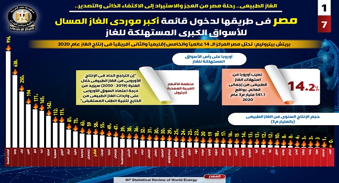 وكشف التقرير عن أن مصر احتلت المركز الـ 14 عالمياً والخامس إقليمياً والثاني إفريقياً في إنتاج الغاز عام 2020، بحجم إنتاج سنوي بلغ 58.5 مليار م3، وذلك وفقاً لبريتش بيتروليم.
