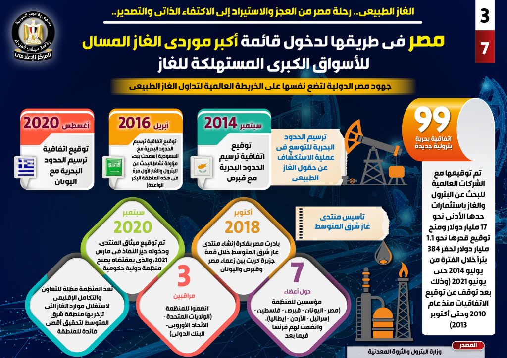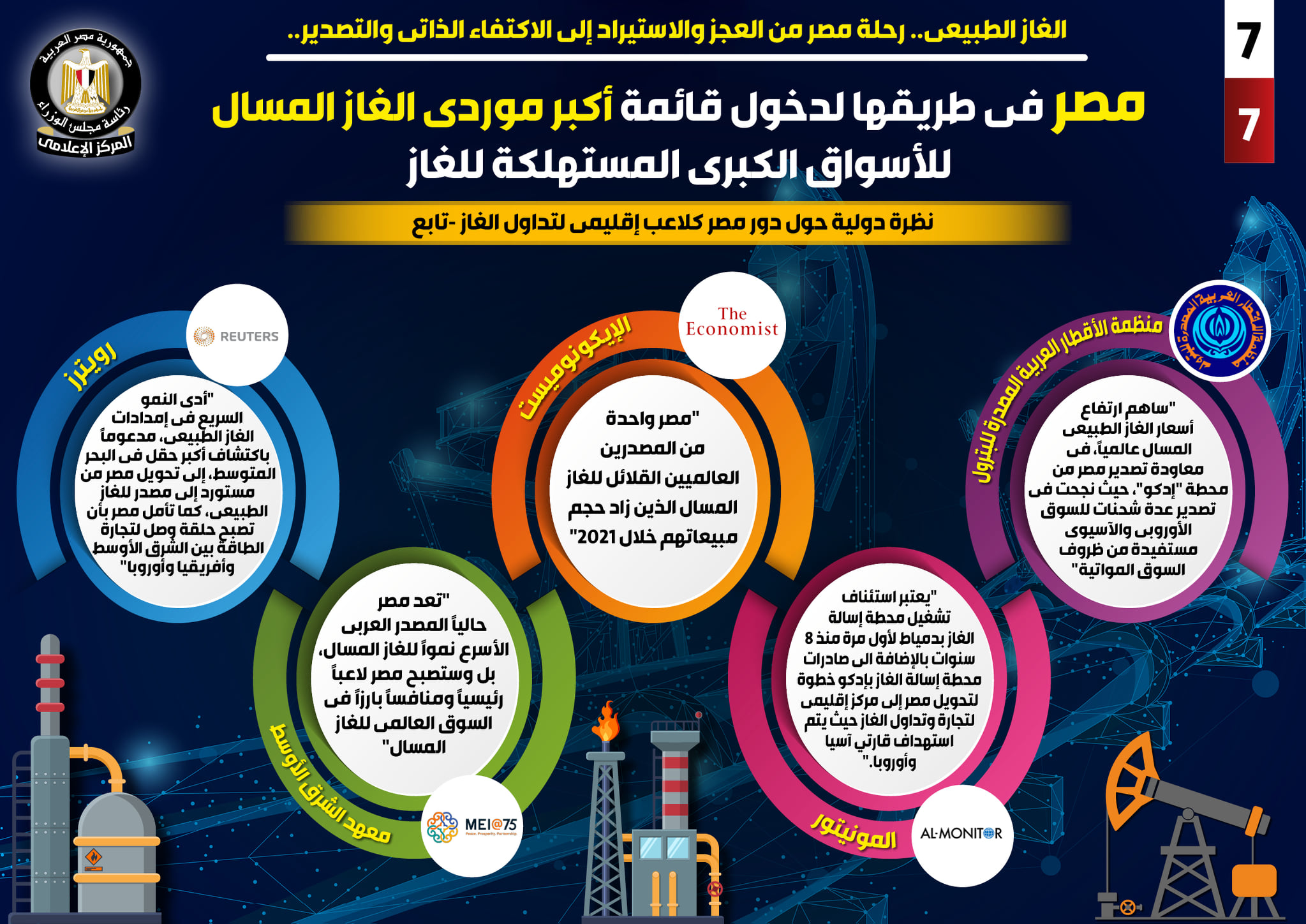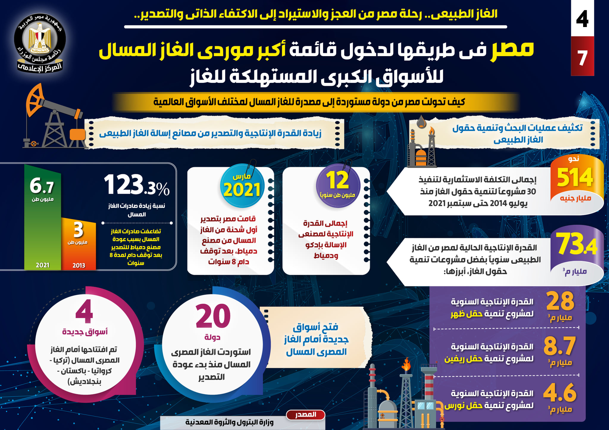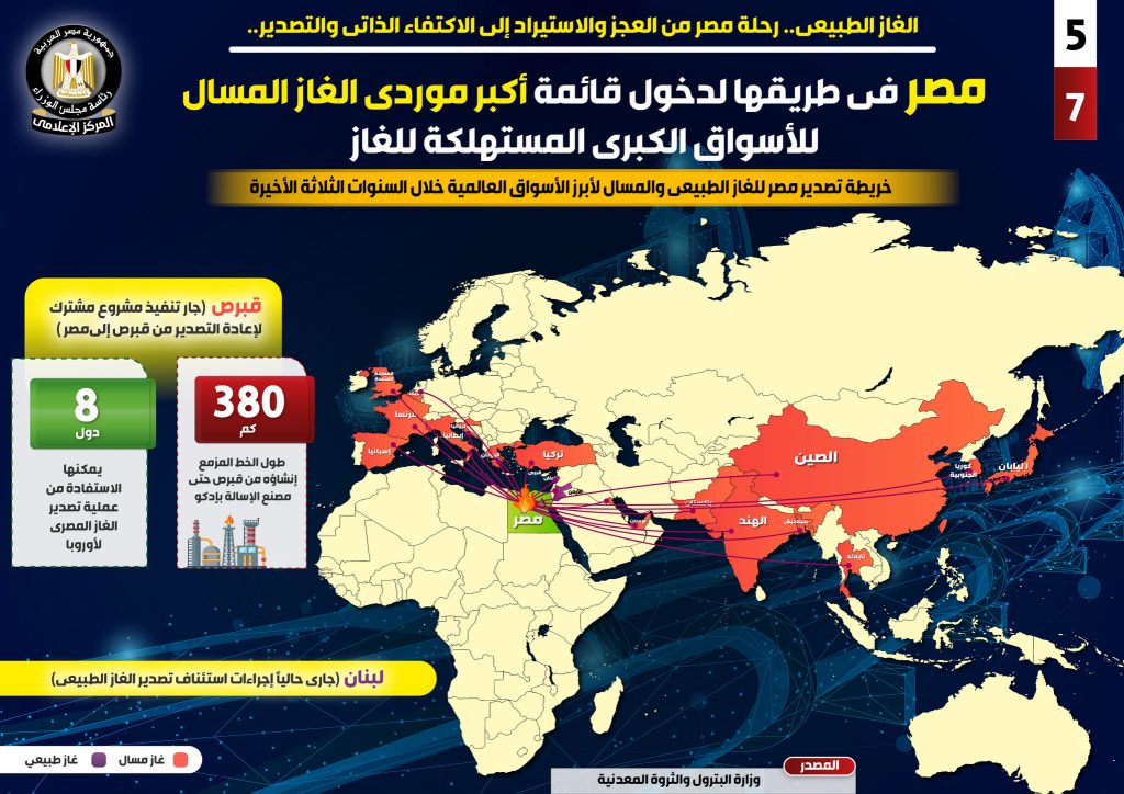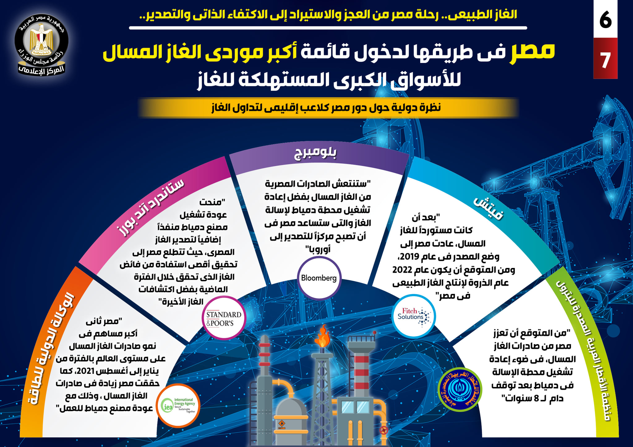 وفي هذا الصدد نشر المركز الإعلامي لمجلس الوزراء تقريراً تضمن إنفوجرافات تسلط الضوء على جهود مصر لدخول قائمة أكبر موردي الغاز المسال للأسواق الكبرى المستهلكة للغاز، وذلك بعد تحقيقها الاكتفاء الذاتي منه.