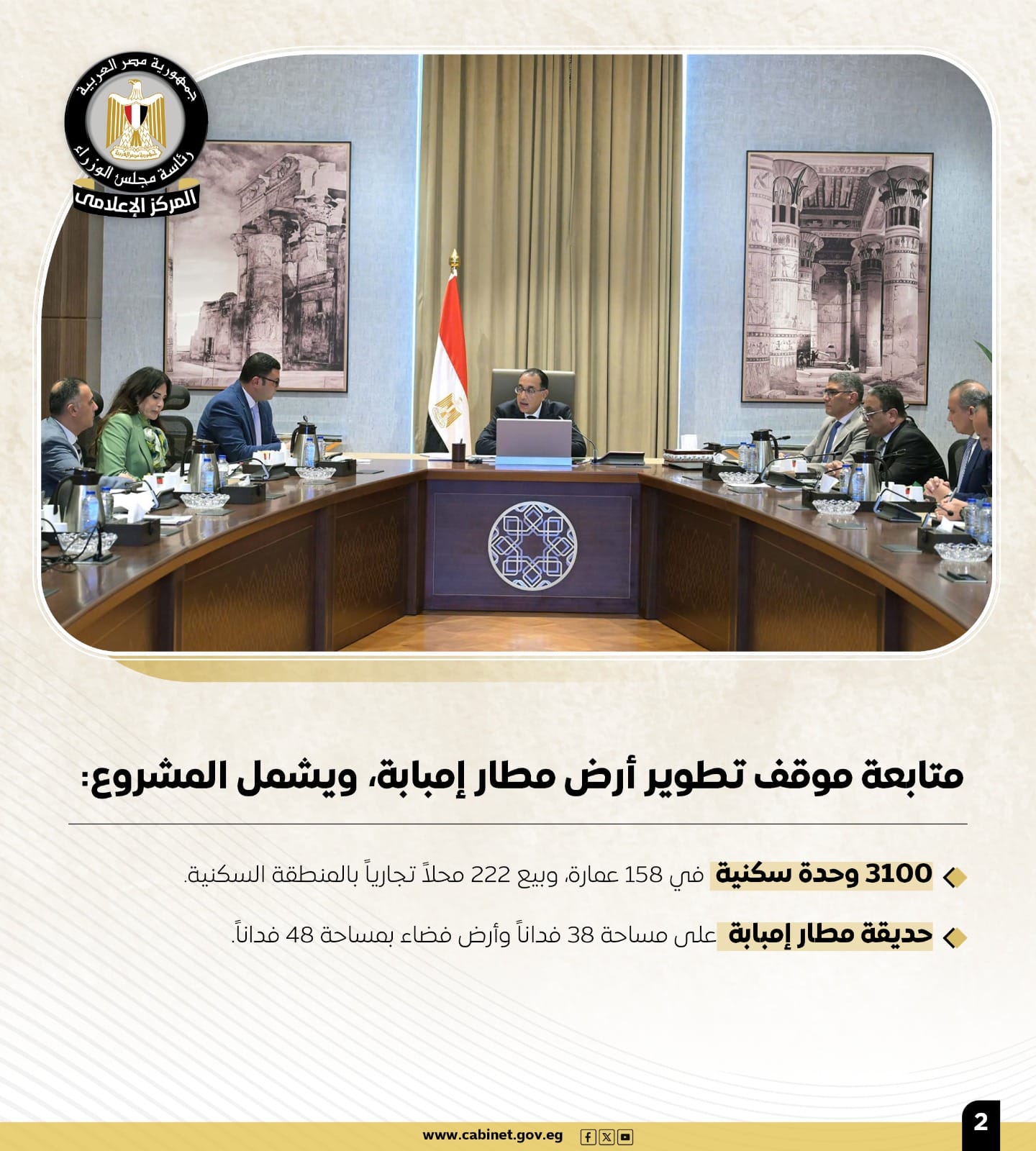 وجاء في التقرير الأسبوعي الصادر عن المركز الإعلامي لمجلس الوزراء، اليوم الجمعة، أن نشاط رئيس الوزراء مصطفى مدبولي شمل متابعة موقف تطوير أرض مطار إمبابة، حيث يتضمن المشروع 3100 وحدة سكنية في 158 عمارة، وبيع 222 محلاً تجارياً بالمنطقة السكنية، بالإضافة إلى حديقة مطار إمبابة على مساحة 38 فداناً وأرض فضاء بمساحة 48 فداناً.