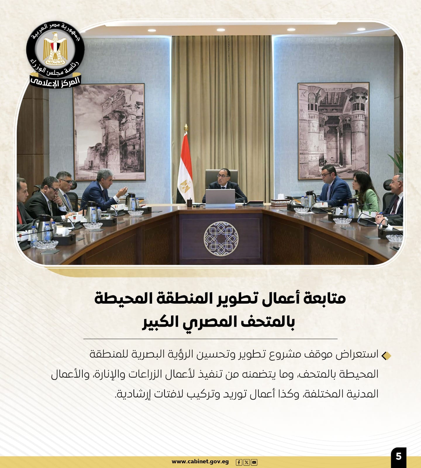 ووفقاً للتقرير، شملت أنشطة رئيس الوزراء متابعة أعمال تطوير المنطقة المحيطة بالمتحف المصري الكبير، بجانب استعراض موقف مشروع تطوير وتحسين الرؤية البصرية للمنطقة المحيطة بالمتحف، وما يتضمنه من تنفيذ لأعمال الزراعات والإنارة، والأعمال المدنية المختلفة، وكذلك أعمال توريد وتركيب لافتات إرشادية.