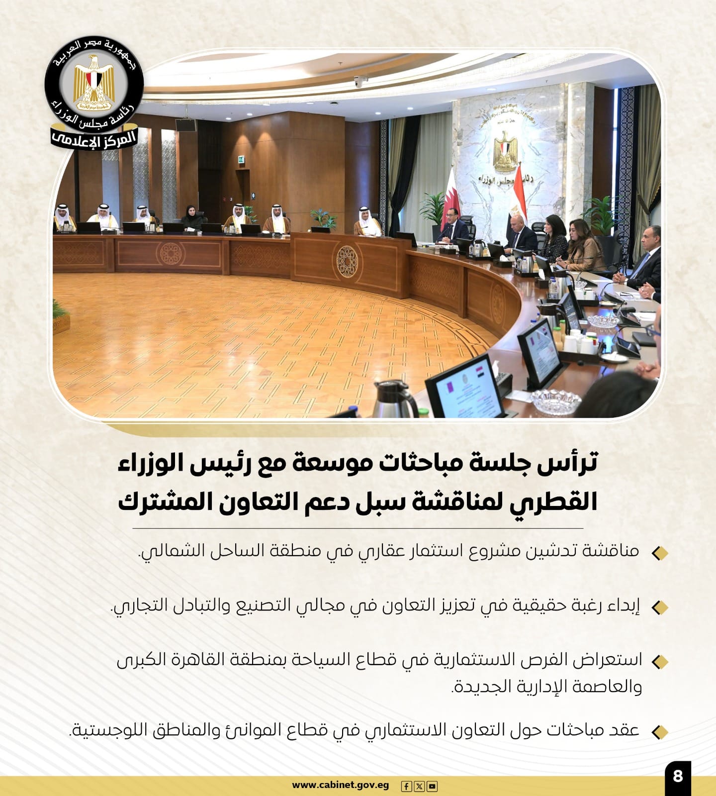 كما ترأس رئيس الوزراء جلسة مباحثات موسعة مع رئيس الوزراء القطري لمناقشة سبل دعم التعاون المشترك، وتم خلالها مناقشة تدشين مشروع استثمار عقاري في منطقة الساحل الشمالي، وإبداء رغبة حقيقية في تعزيز التعاون في مجالي التصنيع والتبادل التجاري، فضلاً عن استعراض الفرص الاستثمارية في قطاع السياحة بمنطقة القاهرة الكبرى والعاصمة الإدارية الجديدة، وعقد مباحثات حول التعاون الاستثماري في قطاع الموانئ والمناطق اللوجستية.