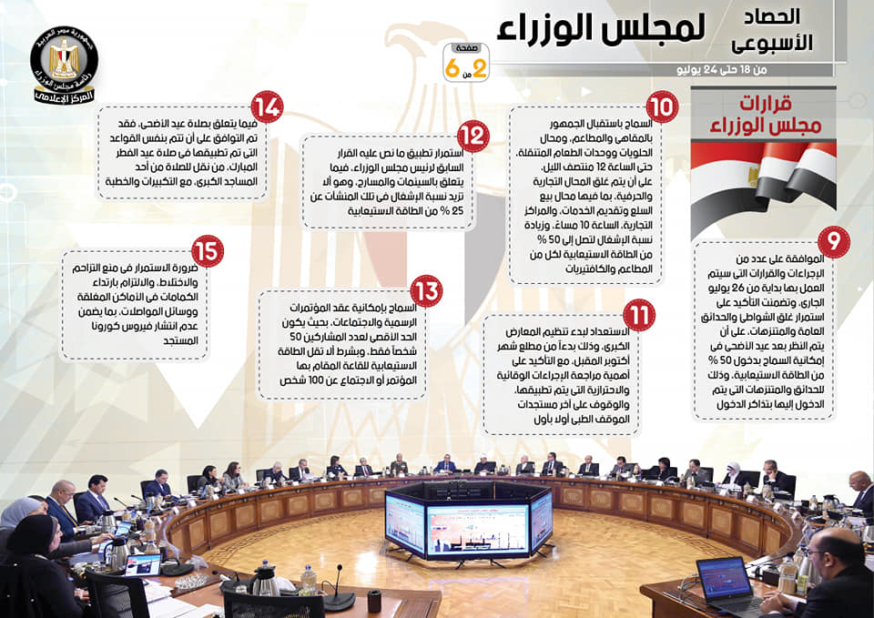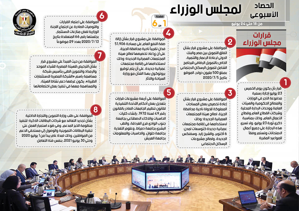 وجاء في الإنفوجراف أنه تمت الموافقة على عدد من القرارات، تشمل قراراً بأن يكون يوم الخميس ٢٣ يوليو إجازة رسمية مدفوعة الأجر في الوزارات والمصالح الحكومية والهيئات العامة ووحدات الإدارة المحلية وشركات القطاع العام وقطاع الأعمال العام، وذلك بمناسبة ذكرى ثورة ٢٣ يوليو، ولا تسري هذه الإجازة على جميع أعمال الامتحانات وتستمر وفقاً للمواعيد المقررة، وكذلك الموافقة على مشروع قرار بشأن اتفاق التمويل بين مصر والبنك الدولي لإعادة الإعمار والتنمية، الخاص بالتمويل الإضافي للبرنامج الشامل لتمويل الإسكان الاجتماعي بمبلغ 500 مليون دولار، الموقع بتاريخ 5 يوليو 2020، فضلاً عن الموافقة على مشروع قرار بشأن إعادة تخصيص بعض المساحات المملوكة للدولة ناحية محافظة الجيزة، لصالح هيئة المجتمعات العمرانية الجديدة؛ وذلك لاستخدامها في إقامة مجتمعات عمرانية جديدة كتوسعات لمدن: 6 أكتوبر، والشيخ زايد، وسفنكس الجديدة، ولصالح مشروعات الإسكان الاجتماعي، هذا بجانب الموافقة على مشروع قرار بشأن إزالة صفة النفع العام على مساحة 51,906 فدان تقريباً ناحية محافظة الجيزة، على أن يُعاد تخصيصها لصالح هيئة المجتمعات العمرانية الجديدة؛ وذلك لاستخدامها في إقامة مجتمعات عمرانية جديدة، على أن يتم توقيع بروتوكول بهذا الشأن مع وزارة السياحة والآثار.