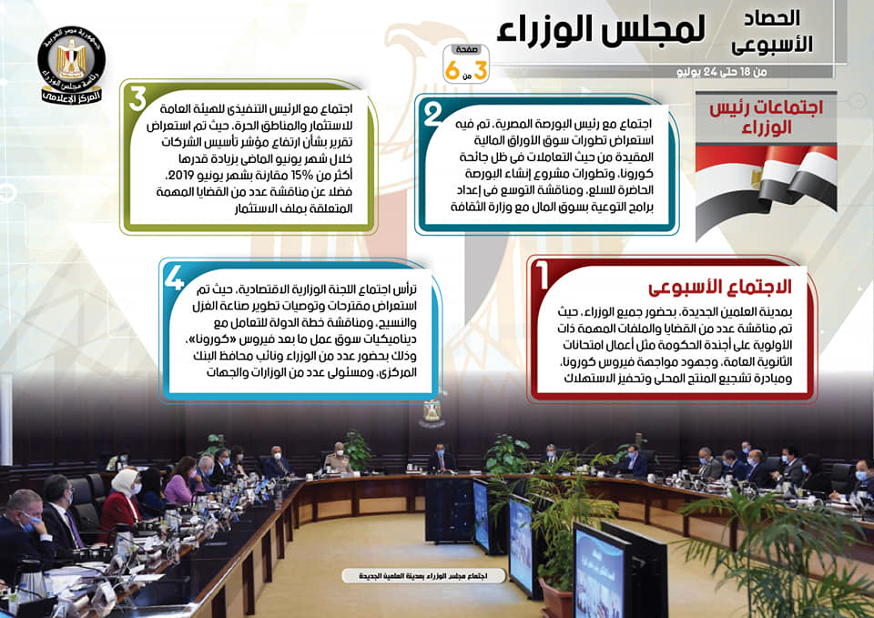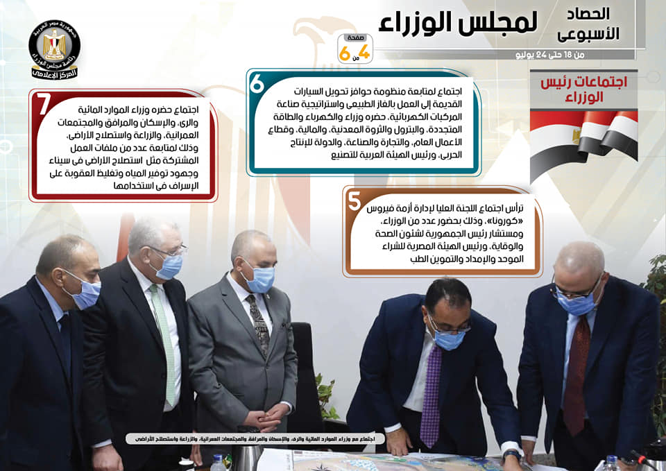 وعلى صعيد الاجتماعات التي عقدها رئيس مجلس الوزراء مصطفى مدبولي، أوضح الإنفوجراف أنه تم عقد عدد من الاجتماعات، شملت الاجتماع الأسبوعي بمدينة العلمين الجديدة، بحضور جميع الوزراء، حيث تم مناقشة عدد من القضايا والملفات المهمة ذات الأولوية على أجندة الحكومة مثل أعمال امتحانات الثانوية العامة، وجهود مواجهة فيروس كورونا، ومبادرة تشجيع المنتج المحلي وتحفيز الاستهلاك، كما ترأس سيادته اجتماع اللجنة العليا لإدارة أزمة فيروس “كورونا”، وذلك بحضور عدد من الوزراء، ومستشار رئيس الجمهورية لشئون الصحة والوقاية، ورئيس الهيئة المصرية للشراء الموحد والإمداد والتموين الطبي، فضلاً عن اجتماع لمتابعة منظومة حوافز تحويل السيارات القديمة إلى العمل بالغاز الطبيعي واستراتيجية صناعة المركبات الكهربائية، حضره وزراء والكهرباء والطاقة المتجددة، والبترول والثروة المعدنية، والمالية، وقطاع الأعمال العام، والتجارة والصناعة، والدولة للإنتاج الحربى، ورئيس الهيئة العربية للتصنيع، وكذلك اجتماع حضره وزراء الموارد المائية والري، والإسكان والمرافق والمجتمعات العمرانية، والزراعة واستصلاح الأراضي، وذلك لمتابعة عدد من ملفات العمل المشتركة مثل استصلاح الأراضي في سيناء وجهود توفير المياه وتغليظ العقوبة على الإسراف في استخدامها.