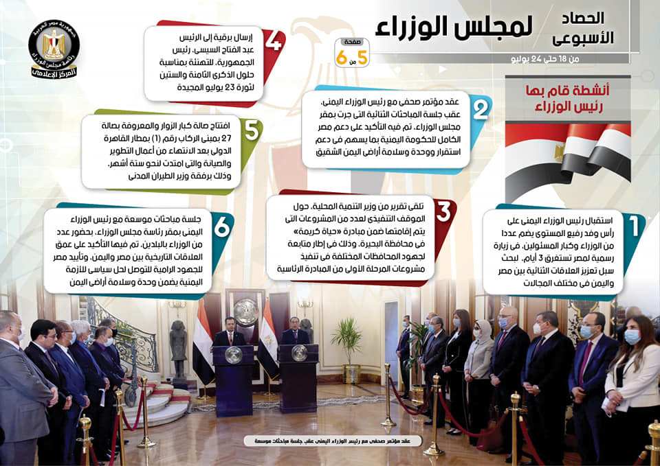 وبشأن الأنشطة التي قام بها رئيس مجلس الوزراء، فبحسب الإنفوجراف، شملت تلقي تقريرا من وزير التنمية المحلية حول الموقف التنفيذي لعدد من المشروعات التي يتم إقامتها ضمن مبادرة “حياة كريمة” في محافظة البحيرة، وذلك في إطار متابعة لجهود المحافظات المختلفة في تنفيذ مشروعات المرحلة الأولى من المبادرة الرئاسية، فضلاً عن استقبال رئيس الوزراء اليمني على رأس وفد رفيع المستوى يضم عدداً من الوزراء وكبار المسئولين، في زيارة رسمية لمصر تستغرق 3 أيام، لبحث سبل تعزيز العلاقات الثنائية بين مصر واليمن في مختلف المجالات، كما عقد سيادته جلسة مباحثات موسعة مع رئيس الوزراء اليمني بمقر رئاسة مجلس الوزراء، بحضور عدد من الوزراء بالبلدين، تم فيها التأكيد على عمق العلاقات التاريخية بين مصر واليمن، وتأييد مصر للجهود الرامية للتوصل لحل سياسي للأزمة اليمنية يضمن وحدة وسلامة أراضي اليمن، هذا بجانب عقد مؤتمر صحفي مع رئيس الوزراء اليمنى، عقب جلسة المباحثات الثنائية التي جرت بمقر مجلس الوزراء، تم فيه التأكيد على دعم مصر الكامل للحكومة اليمنية بما يسهم في دعم استقرار ووحدة وسلامة أراضي اليمن الشقيق.
