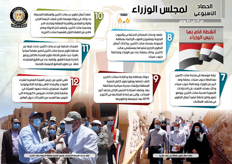 وتضمنت الأنشطة أيضاً وفقاً لما أبرزه الإنفوجراف، افتتاح صالة كبار الزوار والمعروفة بصالة 27 بمبنى الركاب رقم (١) بمطار القاهرة الدولي بعد الانتهاء من أعمال التطوير والصيانة والتي امتدت لنحو ستة أشهر، وذلك برفقة وزير الطيران المدني، كما أرسل سيادته برقية إلى الرئيس عبد الفتاح السيسي، رئيس الجمهورية، للتهنئة بمناسبة حلول الذكرى الثامنة والستين لثورة 23 يوليو المجيدة، وكذلك أجرى سيادته زيارة موسعة إلى مدينة سانت كاترين بمحافظة جنوب سيناء، برفقة وفد كبير من الوزراء ومحافظ جنوب سيناء، وذلك بهدف التعرف على الاحتياجات التنموية لمدينة سانت كاترين، ووضع تصور واضح لخطط تنفيذ أعمال التطوير في مختلف القطاعات، فضلاً عن تفقد وحدات الإسكان الاجتماعي والبيوت البدوية ومشروع الصوب الزراعية بمنطقة الزيتونة بمدينة سانت كاترين، وكذلك أعمال التطوير الجاري تنفيذها بمستشفى سانت كاترين، وذلك برفقة عدد من الوزراء ومحافظ جنوب سيناء، هذا بجانب جولة بمنطقة وادي الراحة بسانت كاترين كلف خلالها بوضع تصور كامل لتنمية المنطقة وإنشاء مدينة سياحية متكاملة بها، وتفقد استراحة الرئيس الراحل محمد أنور السادات، والتي تم إعادة افتتاحها في أكتوبر 2019 بعد ترميمها وتطويرها، بالإضافة إلى تفقد أعمال تطوير دير سانت كاترين والمنطقة المحيطة به، وذلك في جولة موسعة بالدير شملت كنيسة التجلي والوادي المقدس والشجرة المعلقة ومتحف الدير ومحمية سانت كاترين، وتسلم خلال الجولة وسام “الدير من الطبقة الأولى للشهيدة سانت كاترين”.
