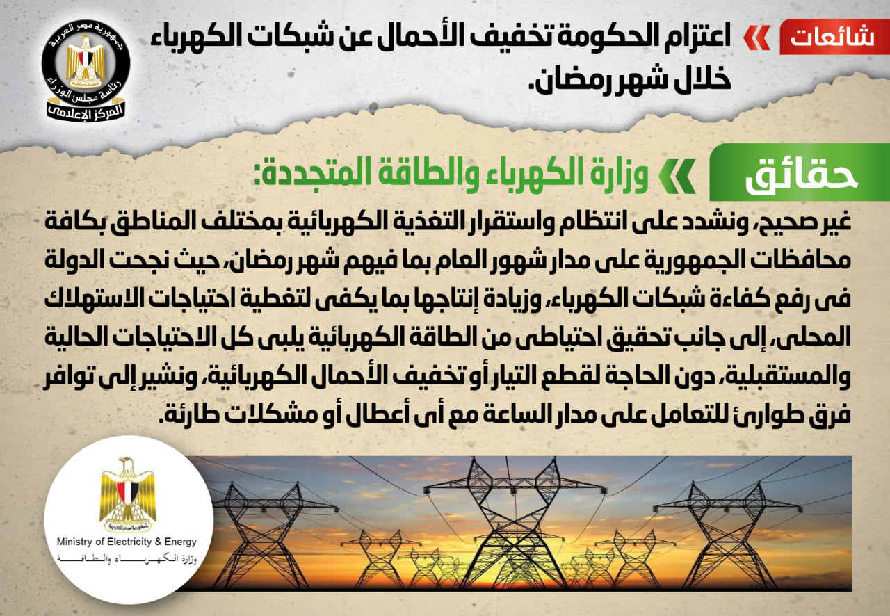 وقال المركز، في بيان اليوم، إنه قام بالتواصل مع وزارة الكهرباء والطاقة المتجددة، والتي نفت تلك الأنباء، مُؤكدةً أنه لا صحة لتخفيف الأحمال عن شبكات الكهرباء خلال شهر رمضان، مُشددةً على انتظام واستقرار التغذية الكهربائية بمختلف المناطق بكافة محافظات الجمهورية على مدار شهور العام بما فيهم شهر رمضان، حيث نجحت الدولة في رفع كفاءة شبكات الكهرباء، وزيادة إنتاجها بما يكفي لتغطية احتياجات الاستهلاك المحلي، إلى جانب تحقيق احتياطي من الطاقة الكهربائية يلبي كل الاحتياجات الحالية والمستقبلية، دون الحاجة لقطع التيار أو تخفيف الأحمال الكهربائية، مُشيرةً إلى توافر فرق طوارئ للتعامل على مدار الساعة مع أي أعطال أو مشكلات طارئة.