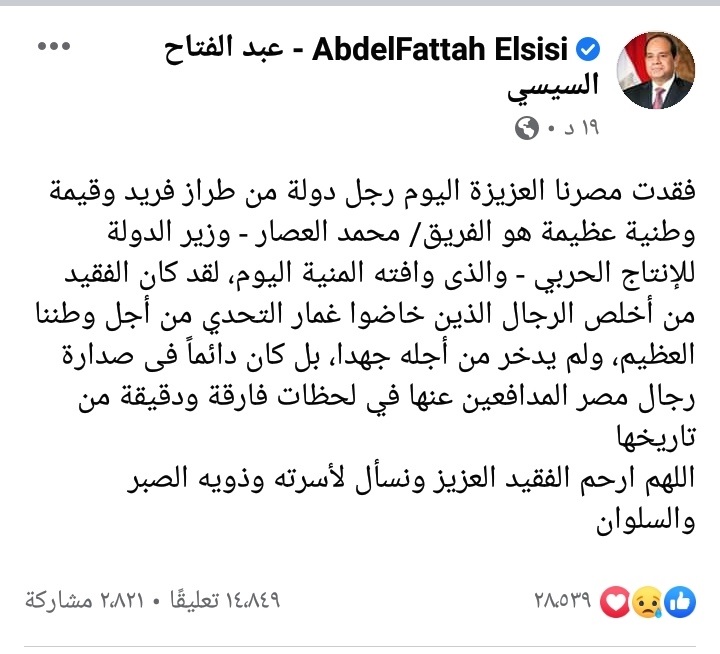وقال الرئيس عبد الفتاح السيسى على حسابه على فيسبوك “فقدت مصرنا العزيزة اليوم رجل دولة من طراز فريد وقيمة وطنية عظيمة هو الفريق محمد العصار .. لقد كان الفقيد من أخلص الرجال الذين خاضوا غمار التحدي من أجل وطننا العظيم، ولم يدخر من أجله جهدا، بل كان دائماً في صدارة رجال مصر المدافعين عنها فى لحظات فارقة ودقيقة من تاريخها .. اللهم أرحم الفقيد العزيز و نسأل لاسرته وذويه الصبر و السلوان “.