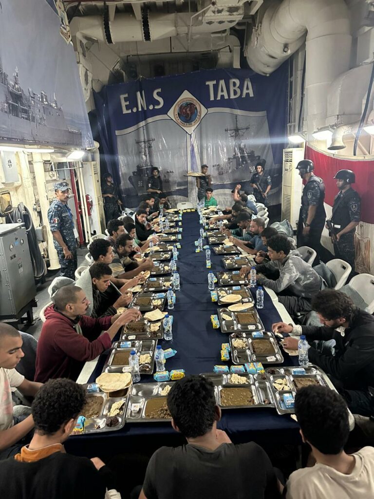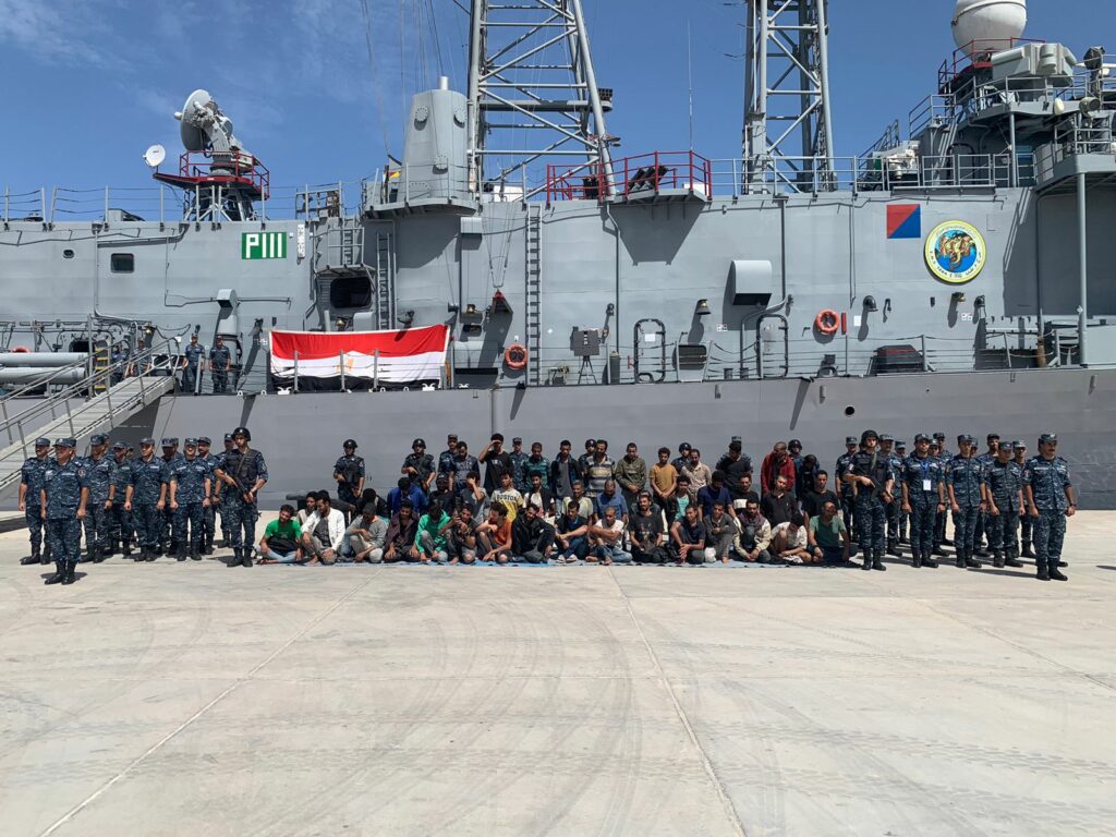 وقد أصدرت القيادة العامة للقوات المسلحة أوامرها بتقديم الدعم والإغاثة لأحد المراكب التي كانت تقوم بنقل أفراد لغرض الهجرة غير الشرعية بعد ورود بلاغ استغاثة منها، وعلى الفور قامت القوات البحرية بدفع وحدة بحرية من قاعدة 3 يوليو، مجهزة بجميع الاحتياجات الطبية والإدارية لتنفيذ أعمال الإغاثة والإخلاء لأفراد المركب، حيث تمكنت من إنقاذ (45) فردا مصريي الجنسية وتم تسليمهم إلى جهات الاختصاص لاتخاذ الإجراءات اللازمة حيالهم.