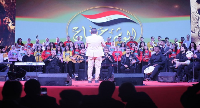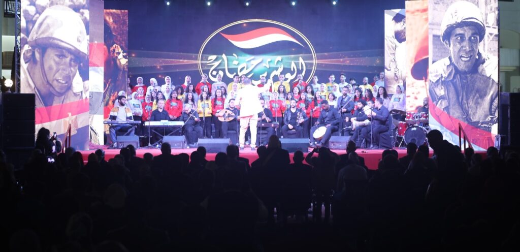 وأحيت الحفل فرقة كورال “هارموني عربى” بجامعة عين شمس، بقيادة المايسترو محمود وحيد، حيث شدت الفرقة بباقة من أشهر الأغانى الوطنية، منها “يابوى يا مصر، أحسن ناس، مصر هى أمى، عربية يا أرض فلسطين، مصر اليوم فى عيد” واختتم الحفل بنشيد الجيش “رسمنا على القلب وجه الوطن”، وقدمت برنامج الحفل الإعلامية “داليا أشرف”.