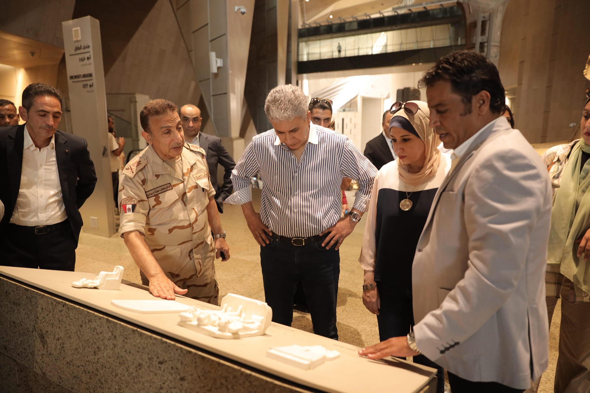 وخلال تفقده لمنطقة الدرج العظيم وقاعات العرض الرئيسية وتلك الخاصة بالملك الذهبي توت عنخ آمون، استمع الوزير شريف فتحي إلى شرح من الدكتور الطيب عباس مساعد الوزير للشئون الأثرية بالمتحف حول آخر مستجدات تنفيذ أعمال العرض المتحفي لمختلف القطع الأثرية، وفلسفة سيناريو العرض المتحفي لها، بالإضافة إلى استعراض ما قام به المتحف من خدماته للسياحة الميسرة من فاقدي البصر للتعرف على المعروضات من الحضارة المصرية العريقة حتي يتسنى لهم لمس المستنسخات الأثرية التي تم إضافتها في بعض الأماكن المحددة بالدرج العظيم والتعرف على شكل القطع الأثرية الأصلية، كما استعرض موقف الأعمال داخل قاعات العرض الرئيسية، بما في ذلك منظومة الإضاءة داخل فتارين العرض، وأعمال وضع وتثبيت القطع الأثرية بها، والوسائط المتعددة.