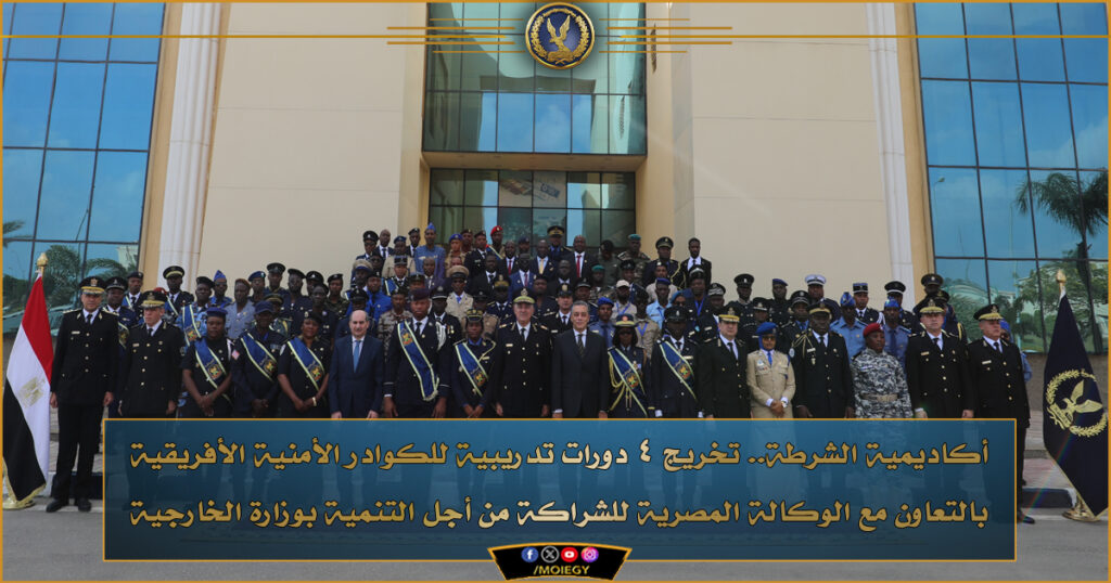 نظمت أكاديمية الشرطة “مركز بحوث الشرطة”، بالتنسيق مع الوكالة المصرية للشراكة من أجل التنمية بوزارة الخارجية، احتفالية لتخريج المتدربين بأربع دورات تدريبية في مجالات (الكشف والتعامل مع المواد المتفجرة والعبوات المرتجلة وفحص آثار ما بعد الانفجار – مكافحة الجريمة المنظمة – مكافحة المخدرات والمؤثرات العقلية – الإدارة الاستراتيجية وتنمية الموارد البشرية في الأجهزة الأمنية)، بإجمالي 84 متدربا ومتدربة من الكوادر الأمنية الأفريقية، يمثلون 28 دولة أفريقية.