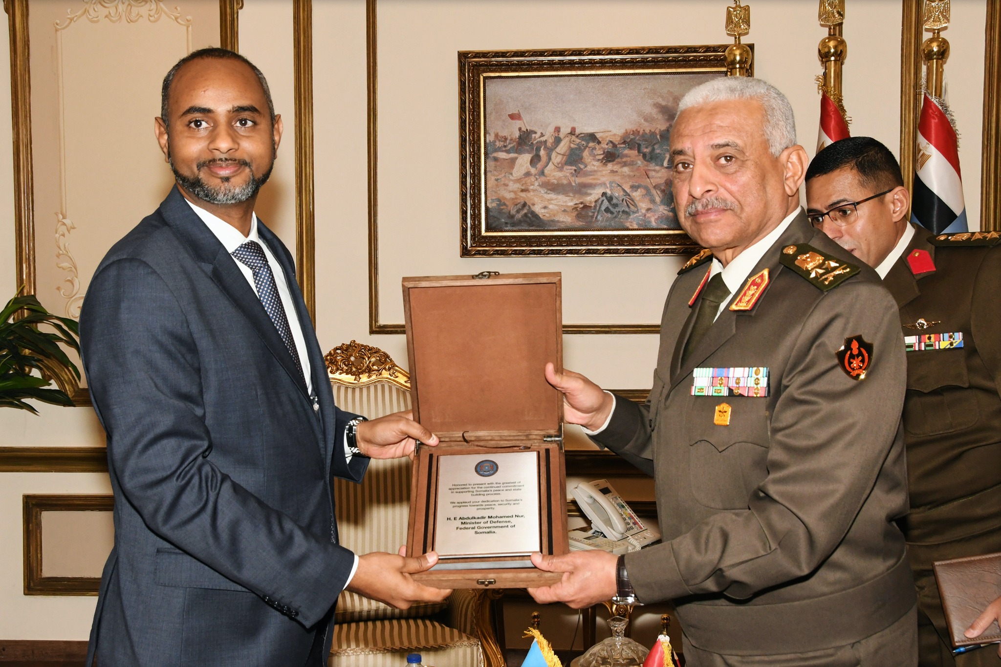 ومن جانبه، أعرب وزير الدفاع الصومالى عن عميق شكره وتقديره لجهود مصر فى إرساء دعائم الأمن والاستقرار لكافة دول القارة الإفريقية ، مرحباً بالمشاركة المصرية ضمن بعثة الإتحاد الإفريقى بدولة الصومال، مؤكدا على أهمية التعاون المشترك بين القوات المسلحة المصرية والصومالية فى مختلف المجالات .