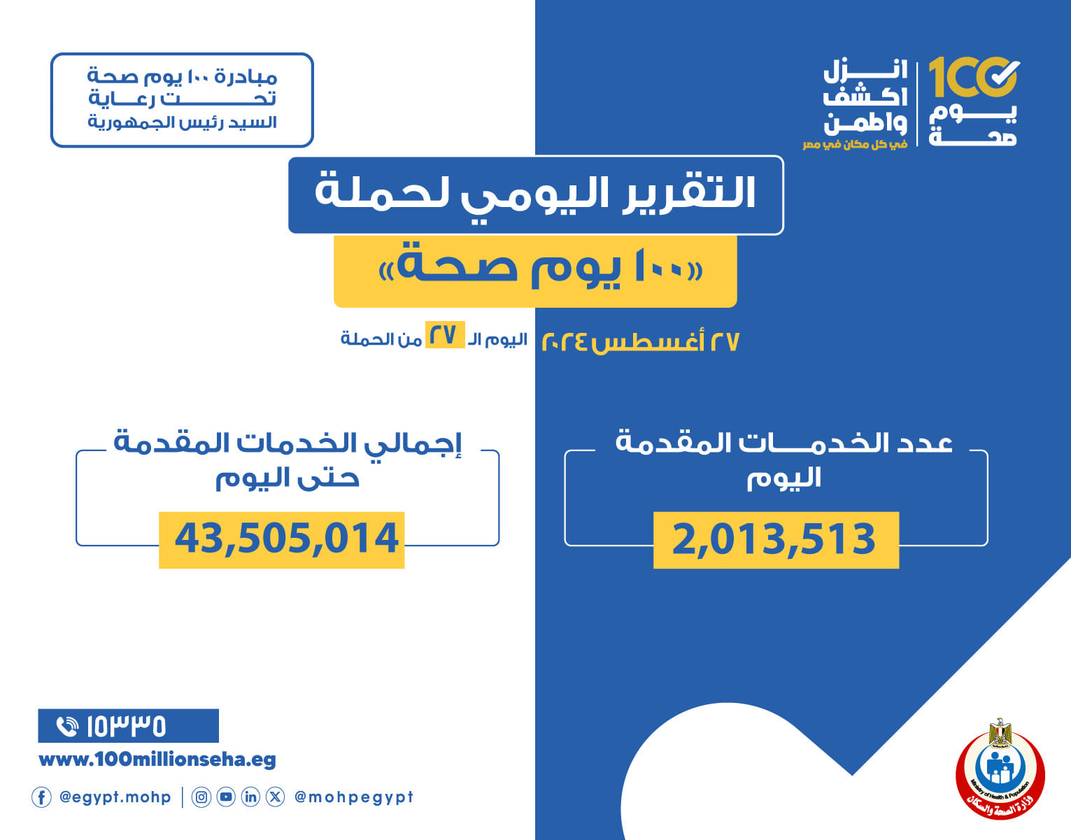 وأشار عبدالغفار إلى أن الحملة قدمت 44 ألفا و377 خدمة، من خلال الوحدات التابعة للهيئة العامة للمستشفيات والمعاهد التعليمية، فيما قدمت مبادرة دعم الصحة النفسية 107 آلاف و979 خدمة، فيما قدمت مستشفيات وعيادات الهيئة العامة للتأمين الصحي 234 ألفاً و949 خدمة.