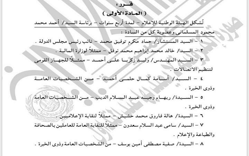 أصدر الرئيس عبدالفتاح السيسي، قرار رقم 520 لسنة 2024 بتشكيل الهيئة الوطنية للإعلام – لمدة أربع سنوات – برئاسة أحمد محمد محمود المسلماني وعضوية كل من :