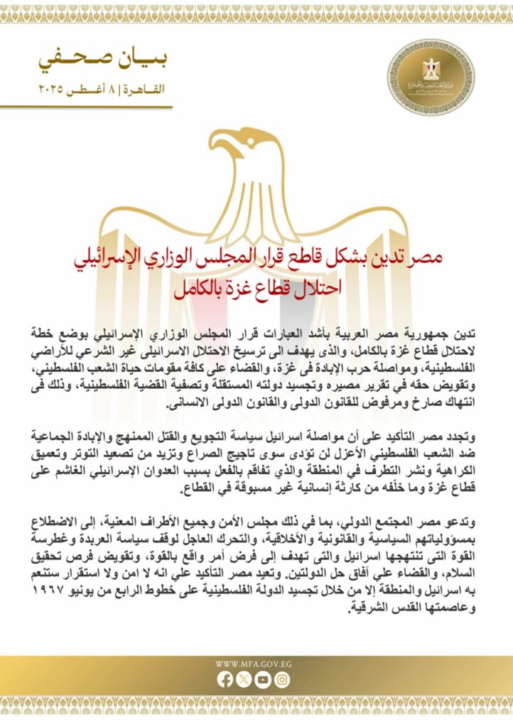 أدانت مصر، فى بيان صادر عن وزارة الخارجية اليوم الجمعة، بأشد العبارات قرار المجلس الوزاري الإسرائيلي بوضع خطة لاحتلال قطاع غزة بالكامل، والذى يهدف إلى ترسيخ الاحتلال الاسرائيلي غير الشرعي للأراضي الفلسطينية، ومواصلة حرب الإبادة فى غزة، والقضاء على جميع مقومات حياة الشعب الفلسطيني وتقويض حقه في تقرير مصيره وتجسيد دولته المستقلة وتصفية القضية الفلسطينية، وذلك في انتهاك صارخ ومرفوض للقانون الدولي والقانون الدولي الإنساني.