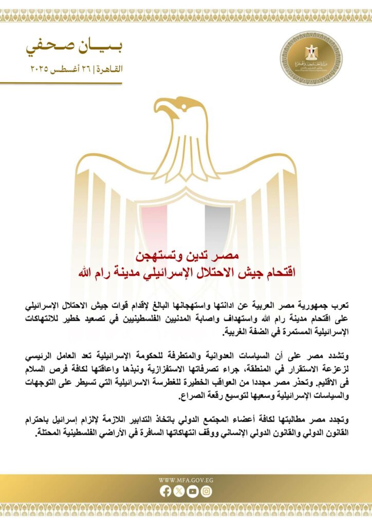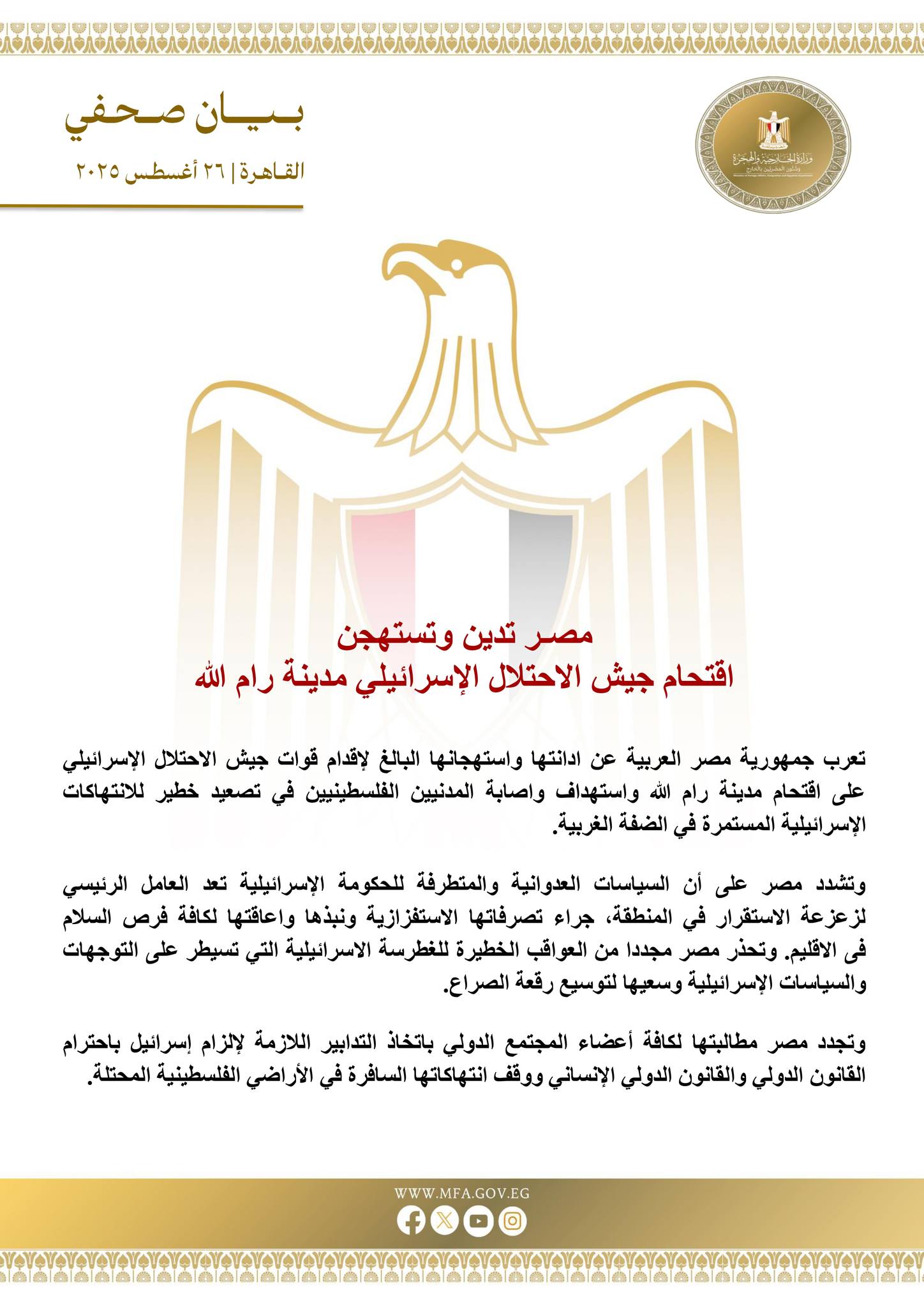مصر تدين وتستهجن اقتحام جيش الاحتلال الإسرائيلى مدينة رام الله