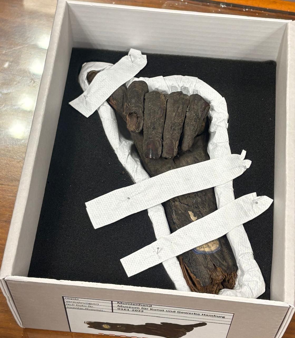 بينما بلغ عدد القطع المستردة من ألمانيا ثلاث قطع تمثلت في: جمجمة، ويد من مومياء أثرية، فضلًا عن تميمة والتي تعد رمز الحياة في الحضارة المصرية القديمة.