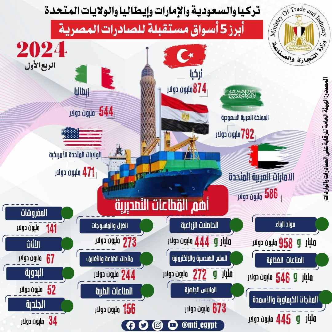 وتضمن التقرير أكبر الأسواق المستقبلة للصادرات السلعية المصرية خلال الربع الأول من العام الجاري والتي شملت تركيا بقيمة 874 مليون دولار، والمملكة العربية السعودية بقيمة 792 مليون دولار، والإمارات العربية المتحدة بقيمة 586 مليون دولار وإيطاليا بقيمة 544 مليون دولار، والولايات المتحدة الامريكية بقيمة 471 مليون دولار.