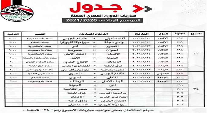 وكشف الاتحاد عن المباريات الثلاث في الجولة الأخيرة، المصري أمام الجيش، والأهلي وأسوان، والزمالك أمام البنك الأهلي، فيما لم يكشف عن مواعيد المباريات الخمسة الأخيرة.