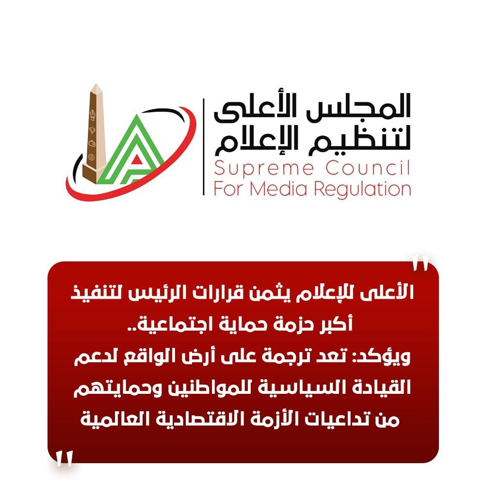 الأعلى للإعلام يثمن قرارات الرئيس لتنفيذ أكبر حزمة حماية اجتماعية.. ويؤكد: تعد ترجمة على أرض الواقع لدعم القيادة السياسية للمواطنين وحمايتهم من تداعيات الأزمة الاقتصادية العالمية