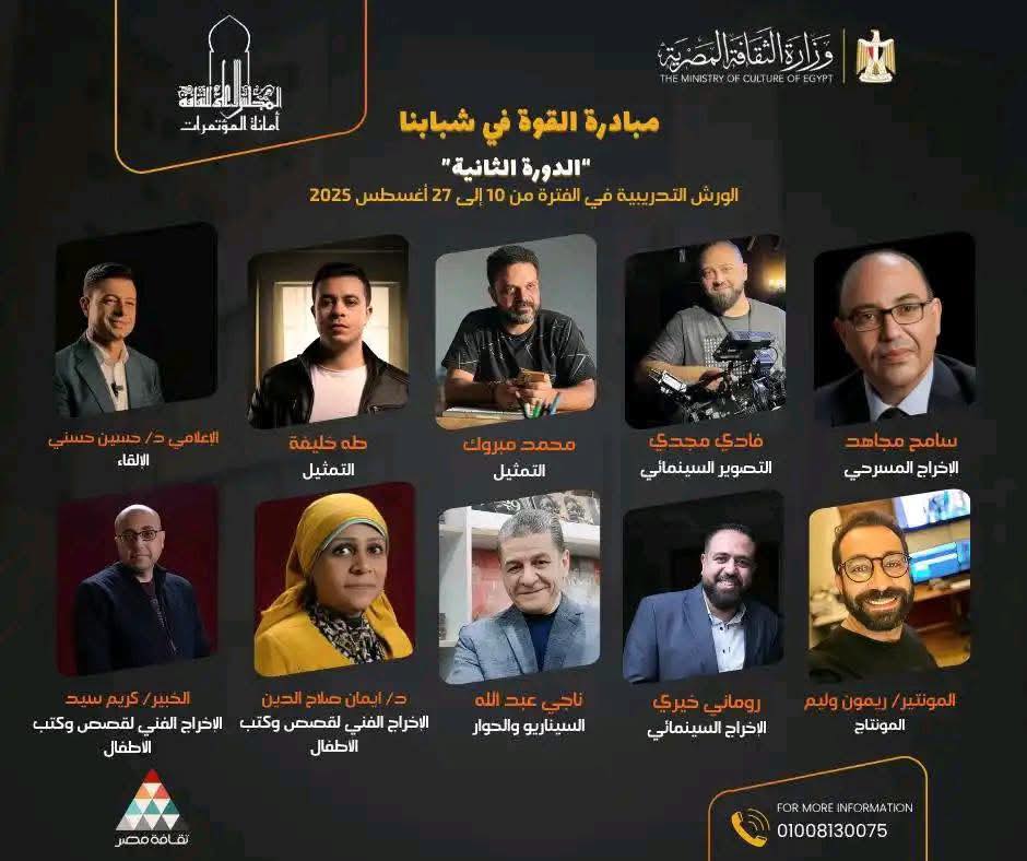 ويشمل برنامج فعاليات المبادرة محاضرات بعنوان: (الشباب وبناء الوعي الجمالي: الثقافة قوة وهوية) يقدمها الدكتور أحمد فؤاد هنو وزير الثقافة، و(رسالة تراثية من تحت الماء: حوارات البحر والتراث المصري المغمور بالمياه) يقدمها الدكتور أسامة النحاس، و(مقدمة في الذكاء الاصطناعي: ماذا يحتاج الشباب أن يعرف؟) يقدمها الدكتور محمد خليف، وغيرها من المحاضرات والورش التدريبية في مجالات الإخراج والسيناريو والتمثيل والمونتاج وتصوير السينما والإلقاء، وذلك بمقر المجلس الأعلى للثقافة.