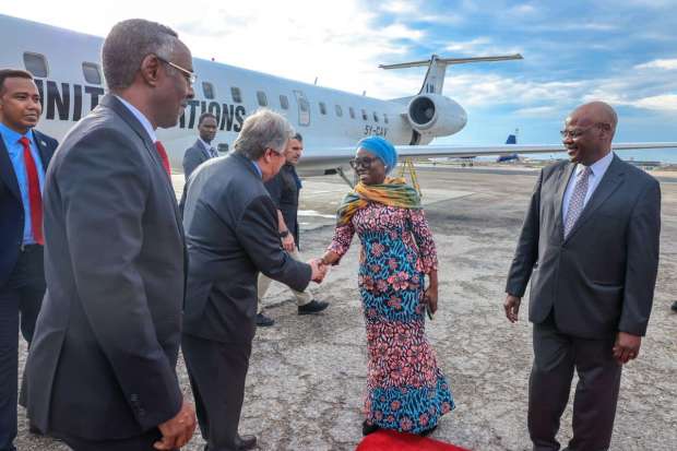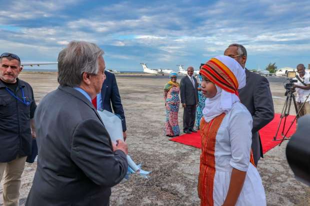 وكان في استقبال جوتيريش والوفد المرافق له في مطار مقديشو، وزير خارجية الصومال أبشر عمر جامع.