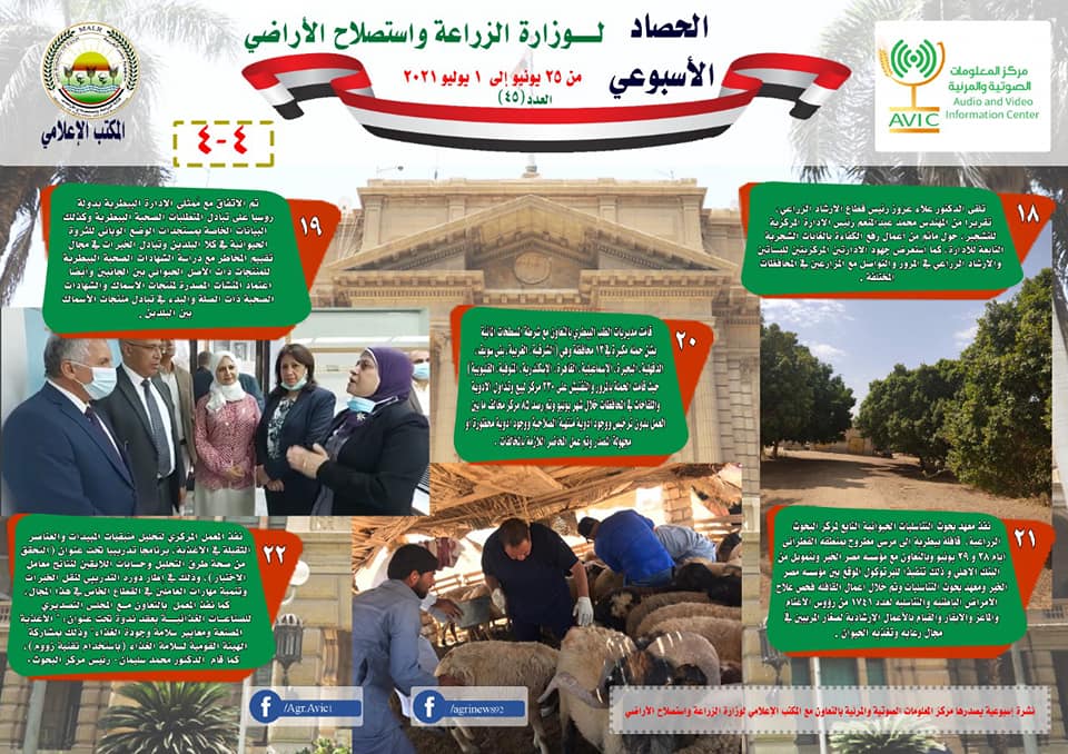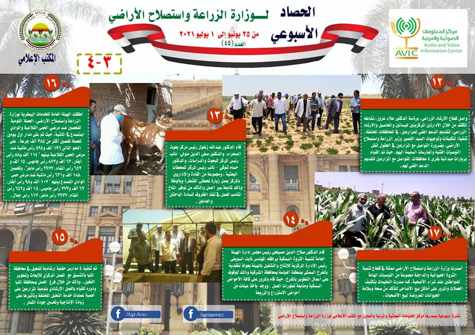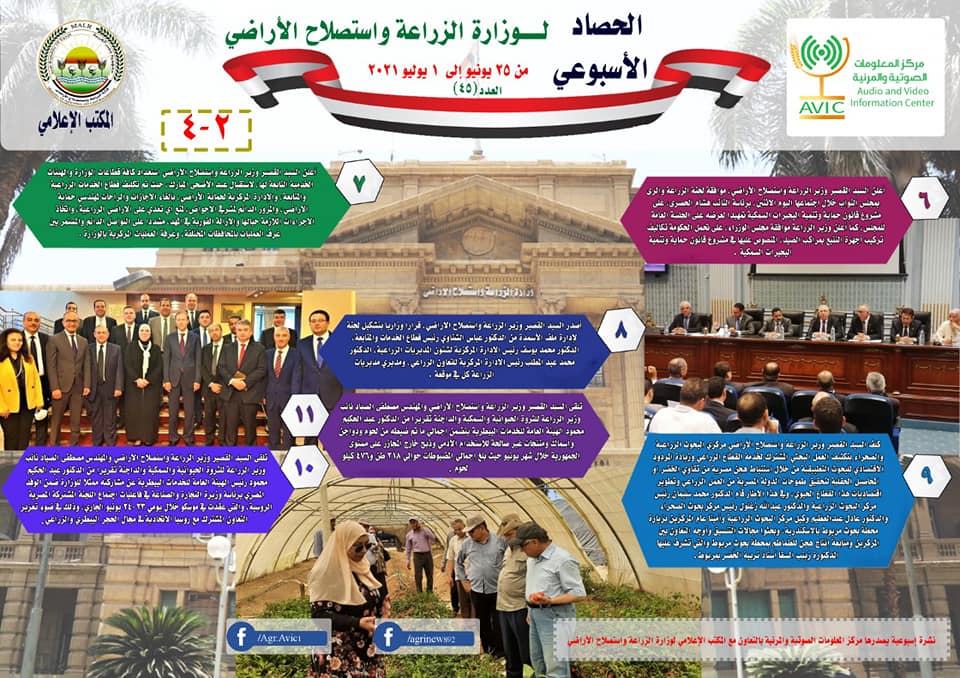أصدر مركز المعلومات الصوتية والمرئية، التابع لوزارة الزراعة واستصلاح الاراضي، “الانفوجراف الاسبوعي” في نسخته رقم ٤٥، حول الحصاد الاسبوعي لأهم أنشطة الوزارة، خلال الاسبوع الماضي في الفترة من ٢٥ يونيو وحتى ١ يوليو الجاري، وذلك بالتعاون مع المكتب الاعلامي للوزارة.
