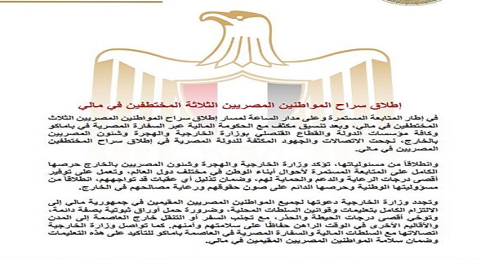 “الخارجية”: إطلاق سراح المواطنين المصريين الثلاثة المختطفين فى مالى