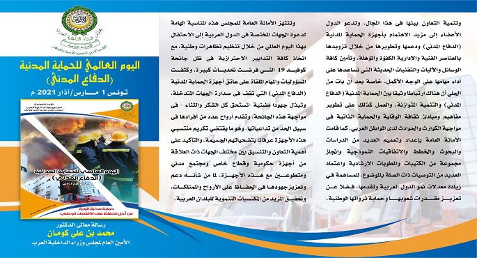 جاء ذلك خلال كلمة الدكتور محمد بن علي كومان الأمين العام لمجلس وزراء الداخلية العرب بمناسبة اليوم العالمي للحماية المدنية، والذي يوافق الأول من مارس كل عام.