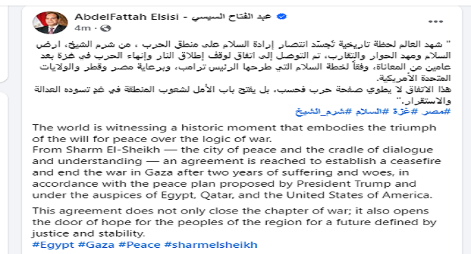 وقال الرئيس السيسى، فى تدوينة على حسابه الرسمي على موقع التواصل الاجتماعي (فيسبوك)، “شهد العالم لحظة تاريخية تُجسّد انتصار إرادة السلام على منطق الحرب، من شرم الشيخ، أرض السلام ومهد الحوار والتقارب، تم التوصل إلى اتفاق لوقف إطلاق النار وإنهاء الحرب في غزة بعد عامين من المعاناة، وفقاً لخطة السلام التي طرحها الرئيس ترامب، وبرعاية مصر وقطر والولايات المتحدة الأمريكية”.