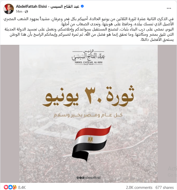 وجّه الرئيس عبد الفتاح السيسي، اليوم، رسالة إلى الشعب المصري عبر صفحته الرسمية على موقع “فيسبوك”، بمناسبة الذكرى الثانية عشرة لثورة الثلاثين من يونيو، أكد خلالها اعتزازه وفخره بالشعب المصرى الذى تمسك ببلده، وحافظ على هويتها، وتحدى الصعاب من أجلها.