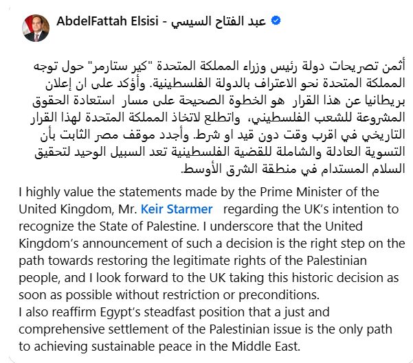 وقال الرئيس السيسي، في تدوينة على صفحته الرسمية على موقع التواصل الاجتماعي “فيسبوك” مساء الثلاثاء،: “أثمن تصريحات دولة رئيس وزراء المملكة المتحدة كير ستارمر حول توجه المملكة المتحدة نحو الاعتراف بالدولة الفلسطينية”.