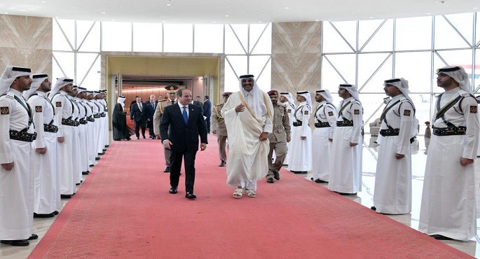وصل السيد الرئيس عبد الفتاح السيسى، إلى مقر الديوان الأميري القطري، حيث كان الأمير تميم بن حمد آل ثاني في مقدمة مستقبليه؛ وبدأت مراسم الاستقبال الرسمية، ويعقب الاستقبال مباحثات رسمية بين وفدي البلدين.