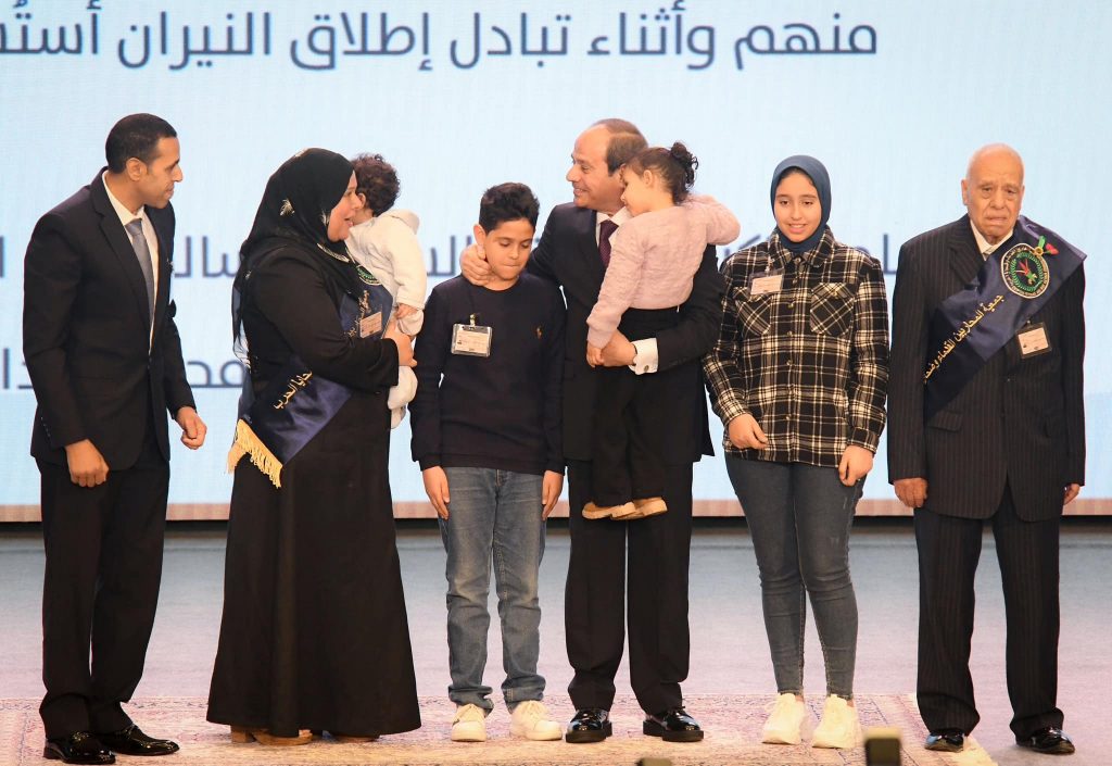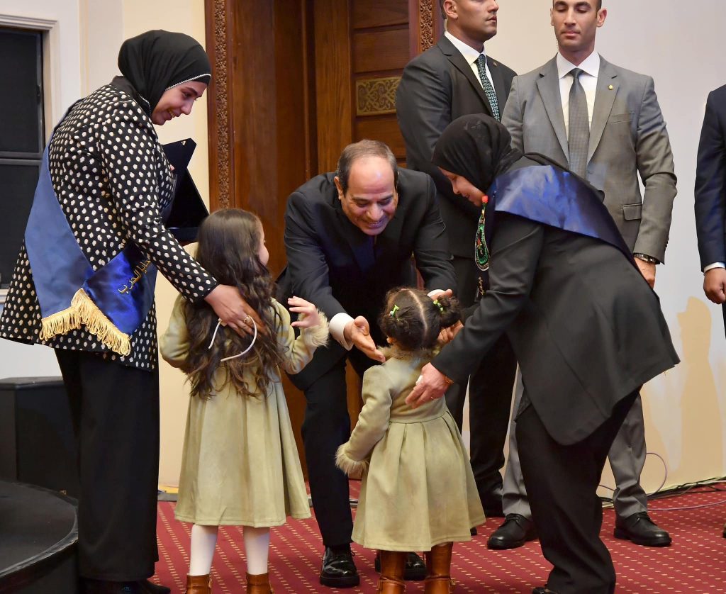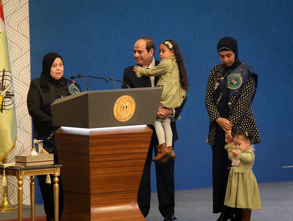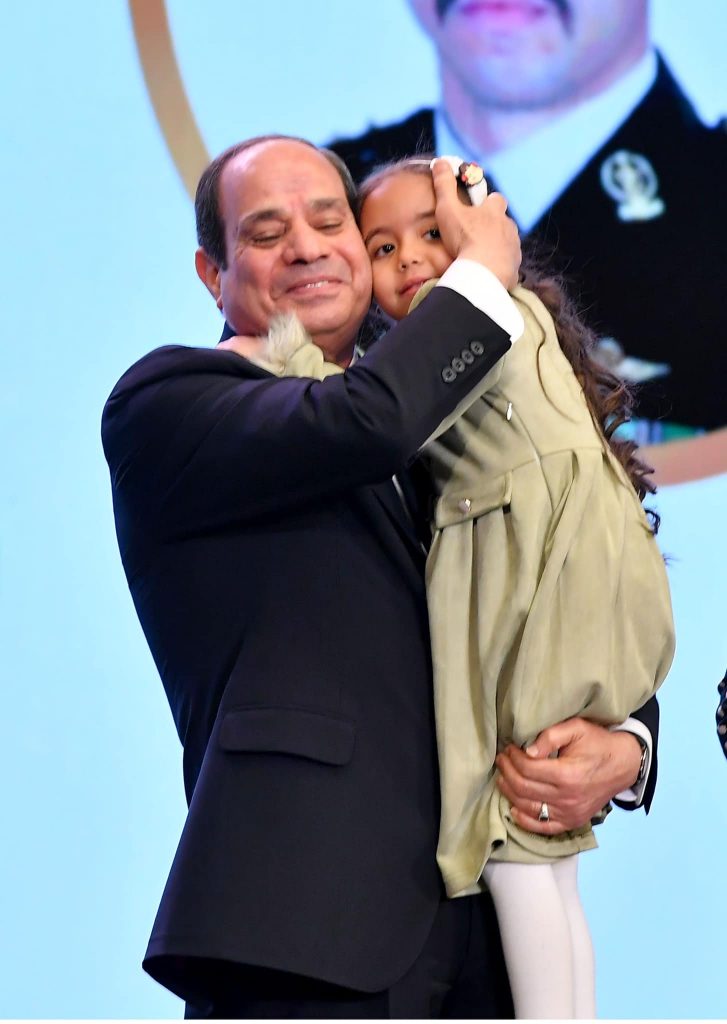 وتوسط الرئيس السيسي، الصور التذكارية من جميع أسر المكرمين، اللذين اصطحبوا أطفال وذوي الشهداء المكرمة أسماؤهم، وأدرا الرئيس حوارا أبويا ووديا مع أسر المكرمين وحمل على كتفه أطفال المكرمين من شهداء الوطن .