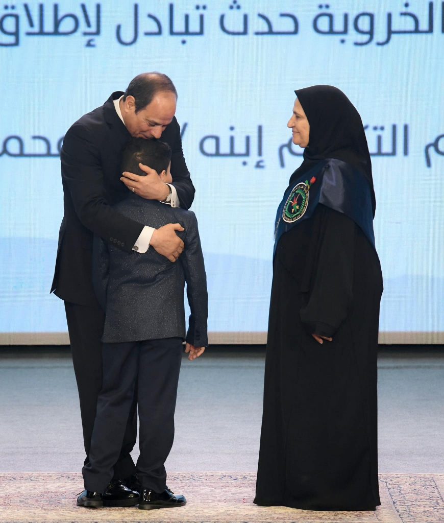واحتضن الرئيس السيسي، الطفل بلال وتوجه به إلى المنصة ليلقي كلمته إلى الحضور حيث قال “والدي استشهد في سيناء وكنت أبلغ من العمر عاما وشهرين .. أنا لم اتمكن من رؤية والدي لكنني سمعت عن بطولاته من جدتي واصدقائه ، وكانوا يقولون إن والدي بطل ولم يخاف أبدا وبعد استشهاد والدي بستة أشهر سافرت والدتي للحج وكان حلمها اللحاق بأبي في الجنة ، وتوفيت في السعودية”.