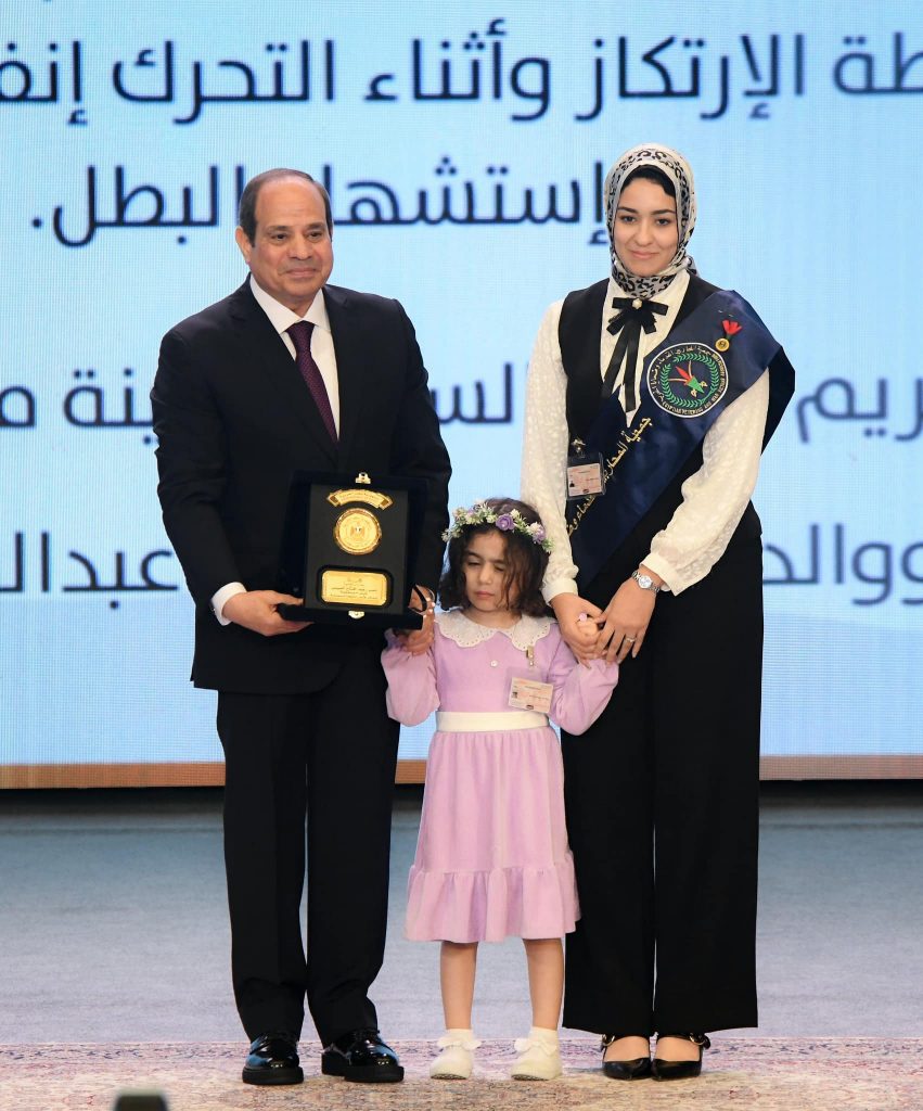 وكرّم الرئيس السيسي أسرة الشهيد البطل العريف معاذ خالد أحمد رشاد، وتسلم التكريم والده خالد أحمد رشاد ووالدته شادية محمد أنور.. وأسرة الشهيد العريف شريف محروس محروس غانم، وتسلم التكريم والده محروس محروس غانم، ووالدته فتحية نعيم عبد الله شلبي.. وأسرة الشهيد الجندي أحمد سمير الشحات السيد أحمد وتسلم التكريم والده سمير الشحات السيد أحمد ووالدته عبير السيد الشافعي أحمد.