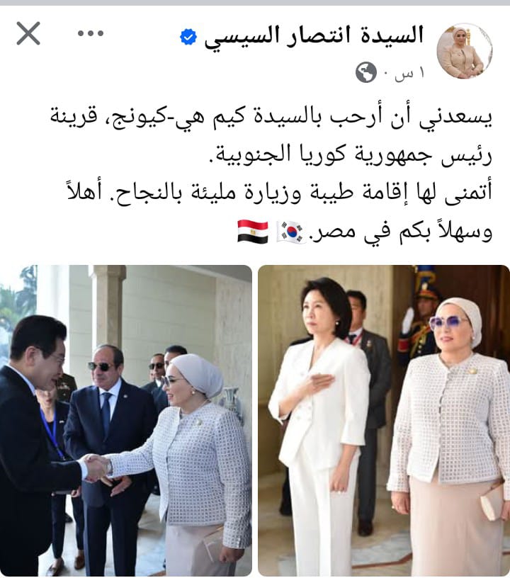 وقالت السيدة انتصار السيسي، في تدوينة على صفحتها الرسمية بمواقع التواصل الاجتماعي،”يسعدني أن أرحب بالسيدة كيم هي-كيونج، قرينة رئيس جمهورية كوريا الجنوبية…أتمنى لها إقامة طيبة وزيارة مليئة بالنجاح.. أهلاً وسهلاً بكم في مصر”.