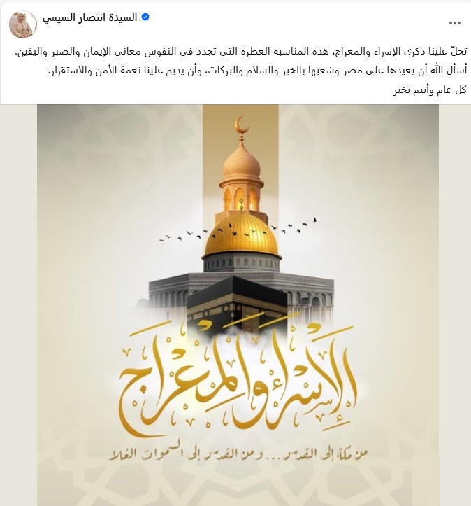 وقالت السيدة انتصار السيسي، في تدوينة على صفحتها الرسمية على مواقع التواصل الاجتماعي، “تحلّ علينا ذكرى الإسراء والمعراج، هذه المناسبة العطرة التي تجدد في النفوس معاني الإيمان والصبر واليقين أسأل الله أن يعيدها على مصر وشعبها بالخير والسلام والبركات، وأن يديم علينا نعمة الأمن والاستقرار كل عام وأنتم بخير”.