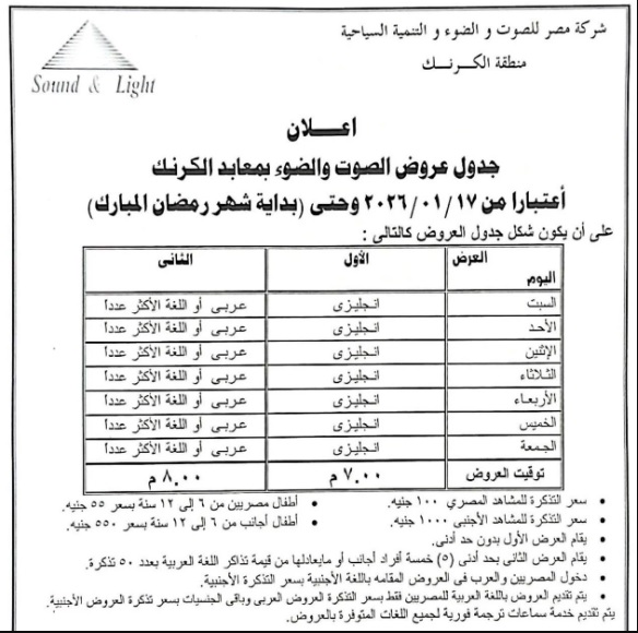 أعلنت شركة مصر للصوت والضوء بمحافظة الأقصر، مواعيد عروض الصوت والضوء بمعابد الكرنك خلال أيام العمل في الإجازة الشتوية بنصف العام الدراسي، والذي يتم تطبيقه حتى شهر رمضان المبارك، ويبدأ من اليوم السبت وينتهى العمل بالجدول الجديد بتاريخ 17 فبراير القادم 2026.