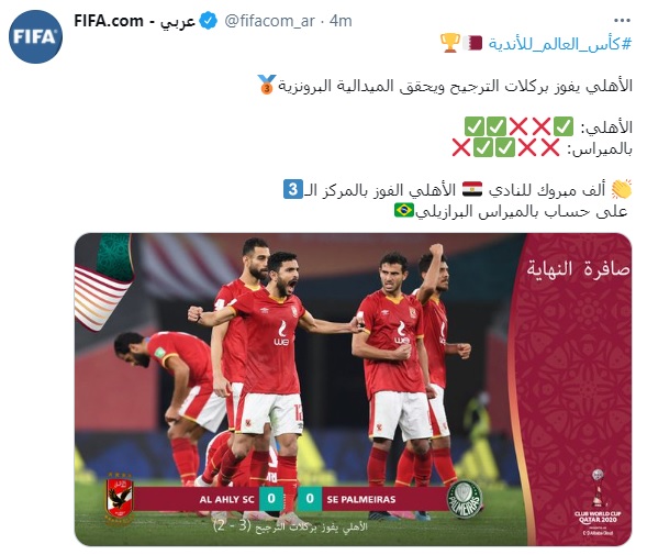 وكتب الفيفا عبر حسابه بموقع التواصل الإجتماعى “تويتر” قائلا:”ألف مبروك للنادى الأهلى الفوز بالمركز الثالث فى كأس العالم للأندية على حساب فريق بالميراس البرازيلى”.
