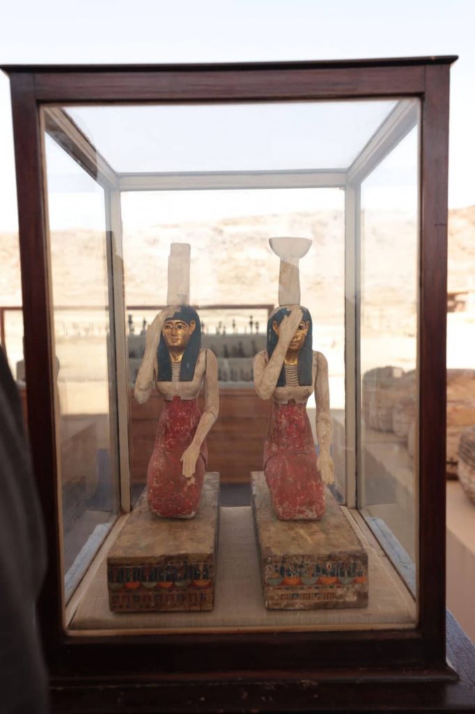 وقد عثرت البعثة أيضا على تمثالين خشبيين ملونين ذو وجه مذهب، في حالة جيدة من الحفظ، للإلهتين إيزيس ونفتيس في وضع النائحات، بالإضافة إلى العثور على دفنة من الدولة الحديثة حوالى 1500 ق.م، بها عديد من أدوات الزينة مثل مرآة من البرونز ومجموعة من الاساور، العقود والأقراط ومكاحل بها المراود الخاصة بها وأدوات من النحاس خاصة بالحياة اليومية.