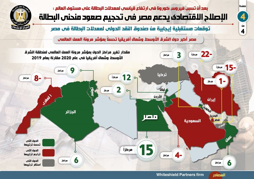 هذا وقد أشادت شركة “Whiteshield Partners”، وهي شركة استشارية عالمية في مجال الاستراتيجيات والسياسات العامة، باقتصاد مصر المتنوع وتمتعه بمستويات مرتفعة من العدالة في توزيع الدخول، إلى جانب تراجع الاعتماد على الموارد الطبيعية، مؤكدةً في الوقت ذاته أن مصر شهدت تحسينات كبيرة على أصعدة التوظيف والفصل، والأعباء الضريبية على العمال والتعاون بين العمال وأصحاب العمل، الأمر الذي دفعها بأن تكون أكبر دول الشرق الأوسط وشمال أفريقيا تحسناً بمؤشر مرونة العمل العالمي، لتحتل المركز الـ 67 عام 2020، مقارنة بالمركز الـ 82 عام 2019، متقدمة بذلك 15 مركزاً.