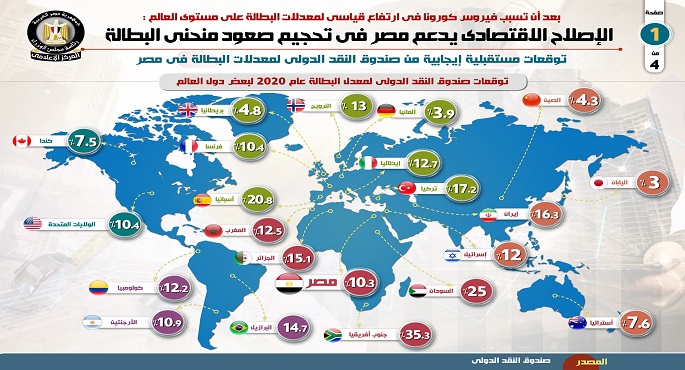نشر المركز الإعلامي لمجلس الوزراء، تقريراً شمل إنفوجرافات تسلط الضوء على قدرة الإصلاح الاقتصادي على دعم مصر في تحجيم صعود منحنى البطالة مصحوباً بتوقعات مستقبلية إيجابية من صندوق النقد الدولي، وذلك بعد أن تسبب فيروس /كورونا/ في ارتفاع قياسي لمعدلات البطالة على مستوى العالم.