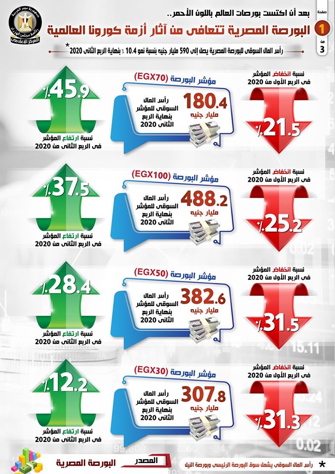 وجاء في الإنفوجراف، ارتفاع رأس المال السوقي والذي يشمل سوق البورصة الرئيسي، وبورصة النيل بنسبة نمو 10.4%، ليصل إلى 590 مليار جنيه، بنهاية الربع الثاني من عام 2020، حيث ارتفع مؤشر البورصة (EGX 70)، بنسبة 45.9% في الربع الثاني من عام 2020، مقارنة بـ 21.5% انخفاض خلال الربع الأول من عام 2020، في حين بلغ رأس المال السوقي للمؤشر نفسه 180.4 مليار جنيه بنهاية الربع الثاني من عام 2020، وبالنسبة لمؤشر البورصة، (EGX100)، فقد ارتفع بنسبة 37.5% في الربع الثاني من عام 2020، مقارنة بـ 25.2% انخفاض خلال الربع الأول من عام 2020، كما بلغ رأس المال السوقي للمؤشر نفسه 488.2 مليار جنيه بنهاية الربع الثاني من عام 2020.