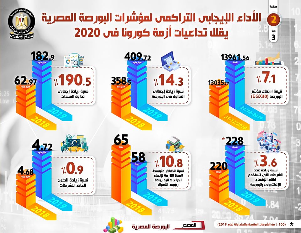 وجاء في الإنفوجراف، زيادة عدد الشركات التي تستخدم نظام الإفصاح الإلكتروني بالبورصة، بنسبة 3.6%، لتصل إلى 228 شركة عام 2019، -تمثل نسبة 100% من الشركات المقيدة والمتداولة- مقارنة بـ 220 شركة عام 2018، فضلاً عن انخفاض متوسط المدة اللازمة لإنهاء إجراءات قيد زيادة رؤوس الأموال بنسبة 10.8%، لتصل إلى 58 يوماً عام 2019، مقارنة بـ 65 يوماً عام 2018، كما زاد الطرح الخاص للشركات بنسبة 0.9%، ليصل إلى 4.72 مليار جنيه عام 2019، مقارنة بـ 4.68 مليار جنيه عام 2018.